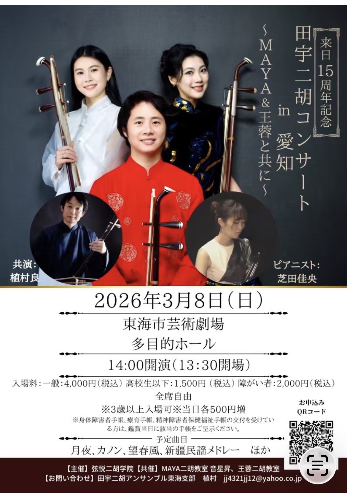 愛知県に田宇さんとお仲間の方々をお呼びしてコンサートを開催します。(私も共演します🎶)